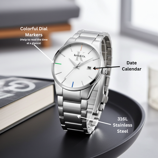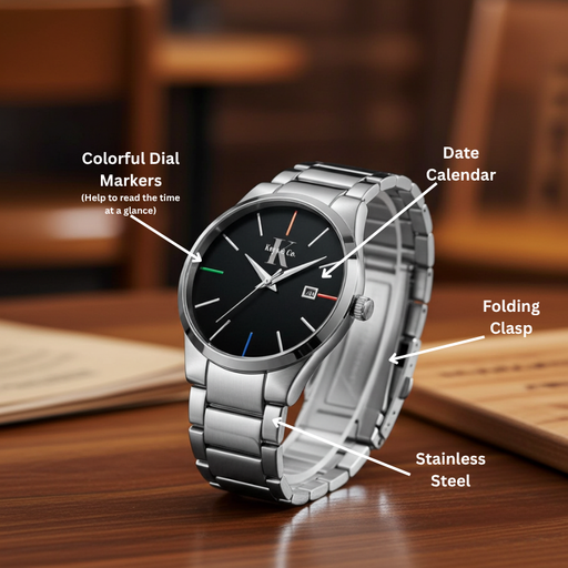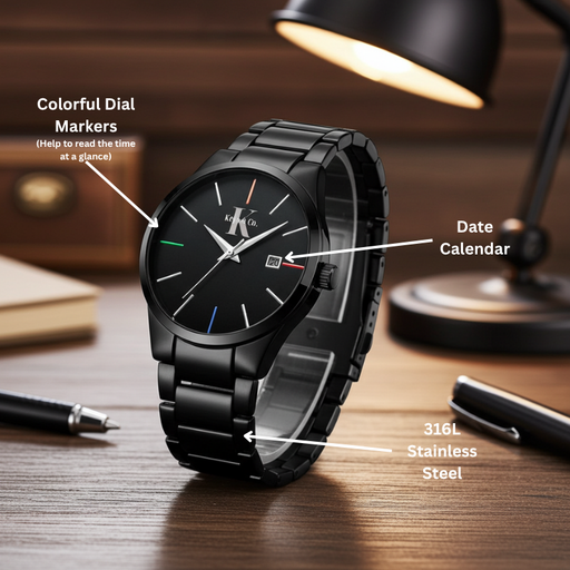 Beautiful matte black stainless steel composes the unique white dial with colorful markers and date window. This sleek watch will never let you fee...